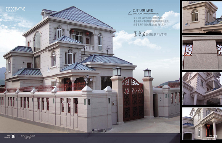 適用于山莊別墅、酒店、賓館、娛樂場所、商業(yè)會(huì)所等建筑物內(nèi)外墻大面積使用。